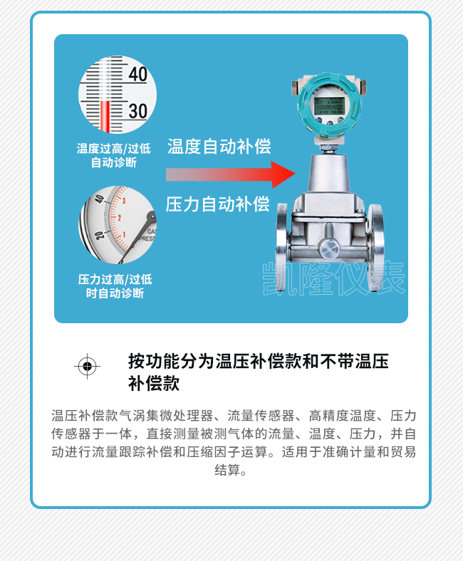 旋進旋渦混合氣流量計無可動部件,測量精度高,穩定性好,長期使用無需特殊維護,價格便宜,性價比高,智能液晶表頭可現實瞬時流量、累計流量、溫度和壓力,輸出脈沖或電流信號,可帶RS485接口,可與控制器配合使用,天津凱隆為您提供多種功能的流量計。